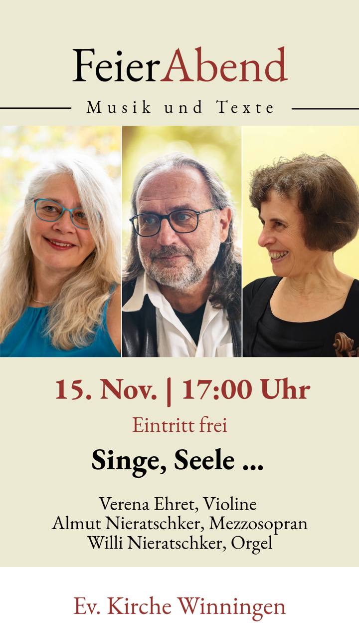 Und dann freuen wir uns auf unser treues Publikum sowie viele „Neue“ am 15.11. um 17:00 Uhr in der Winninger Kirche.